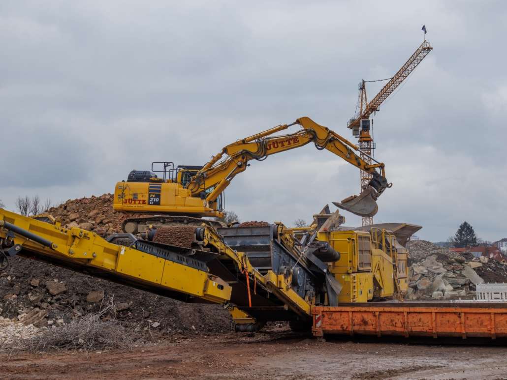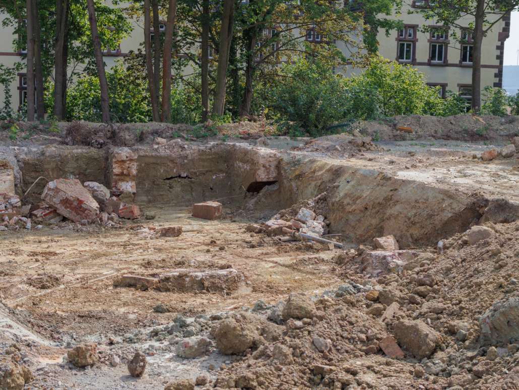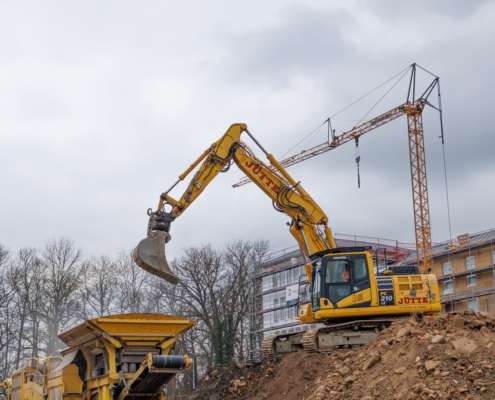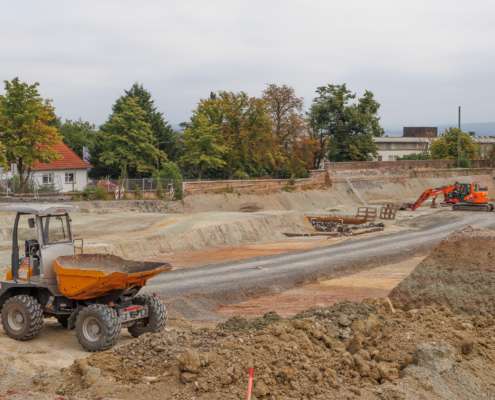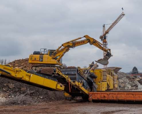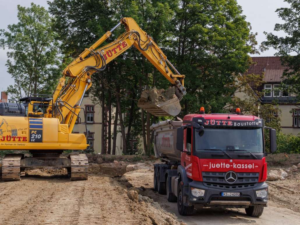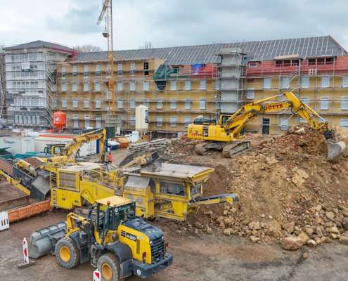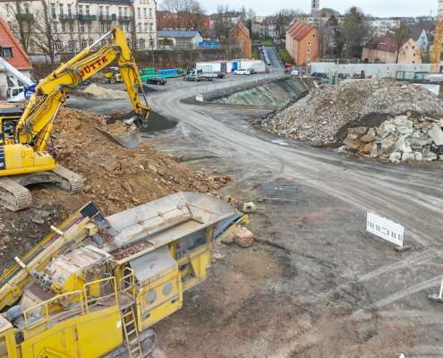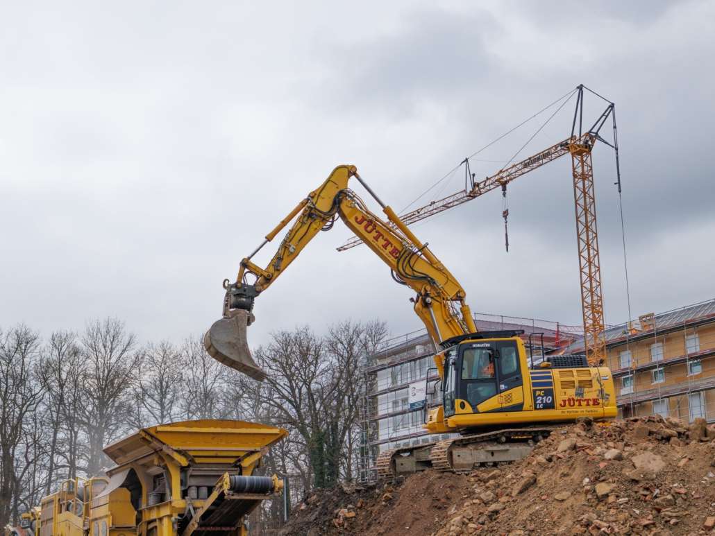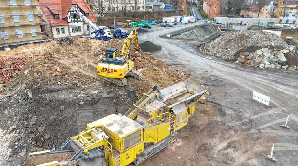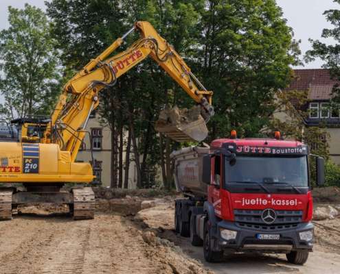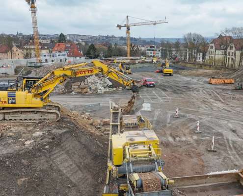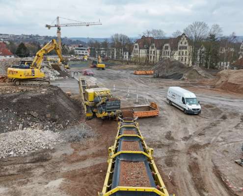 In dem Wohngebiet Kassel Wehlheiden wurden verschiedene Tiefbauarbeiten getätigt. Unter anderem wurden alte Bauwerksmauern und Fundamente ausgegraben, neue Fundamente hergestellt, Baustraßen und Baugruben errichtet, tonnenweise Erde abgefahren, Bauschutt zerkleinert und enthaltenes Metall aussortiert sowie Bauschutt vor Ort mit unserem Brecher durchgemahlen und wiederverwendet.