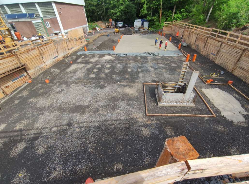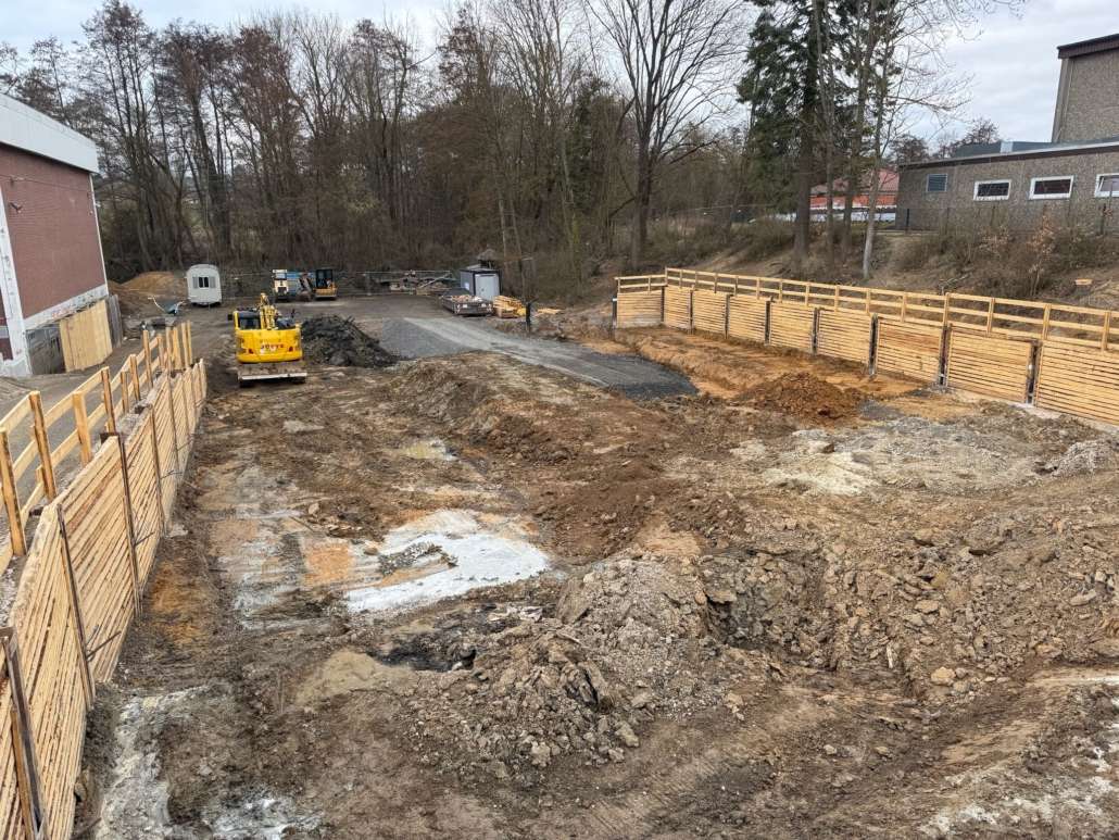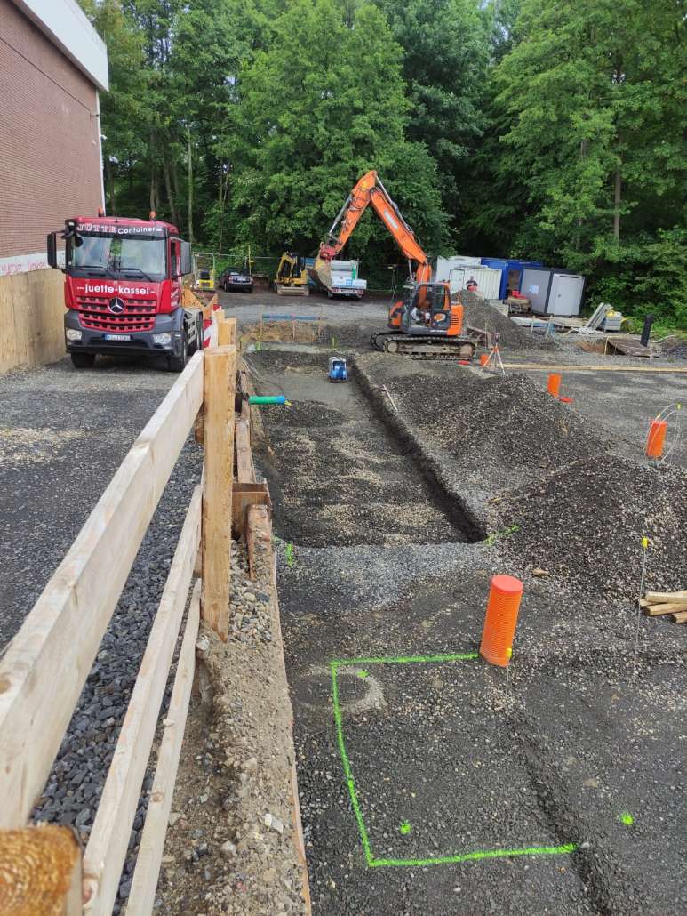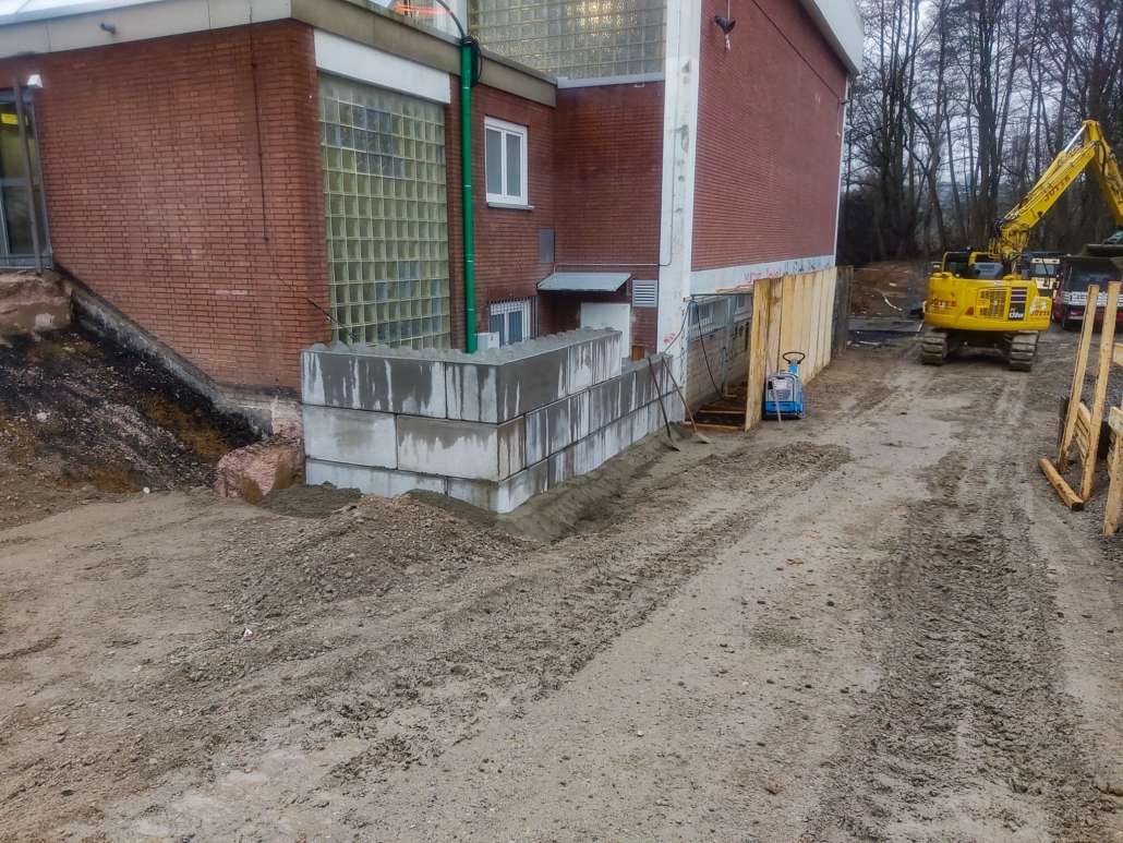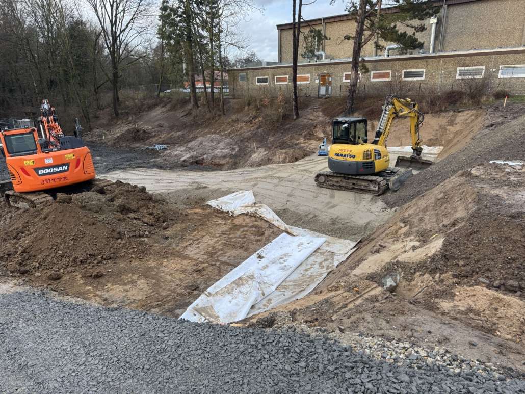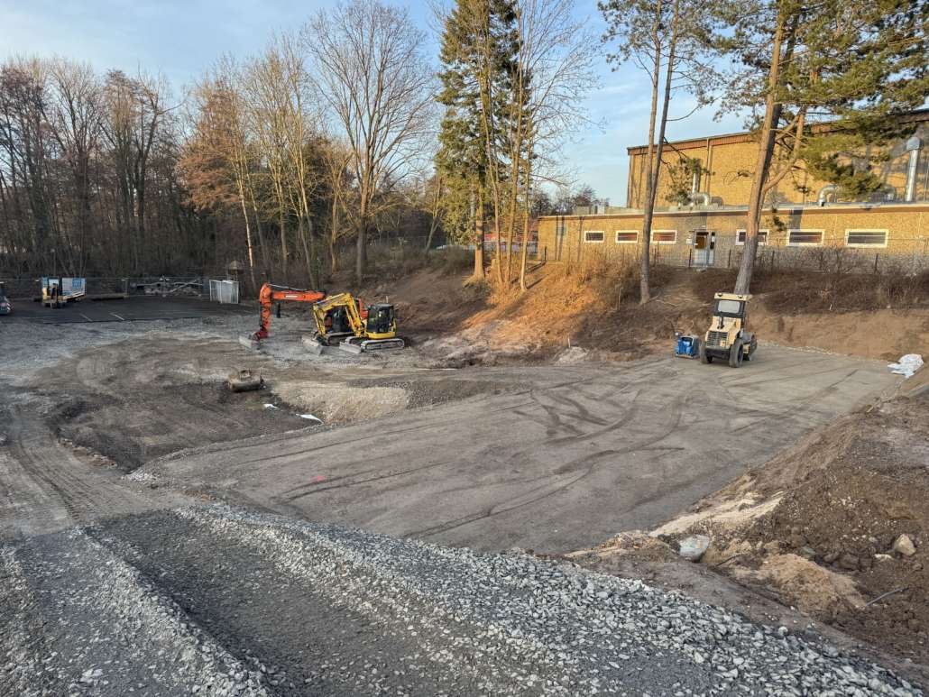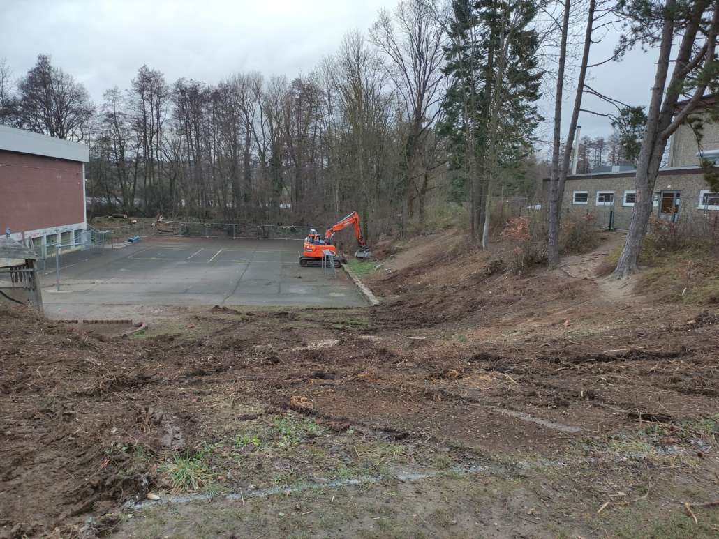 Dann wurde die Grundstücksfläche für den Neubau, als Erweiterung der Schule, vorbereitet. Dabei wurde der Hang zur Straße entfernt und alles planeben hergestellt. Verfüllt wurde die Fläche mit Schotter. Außerdem wurden auf der gesamten Fläche Entwässerungsrohre verlegt, die schließlich mit Kies herum verfüllt wurden.