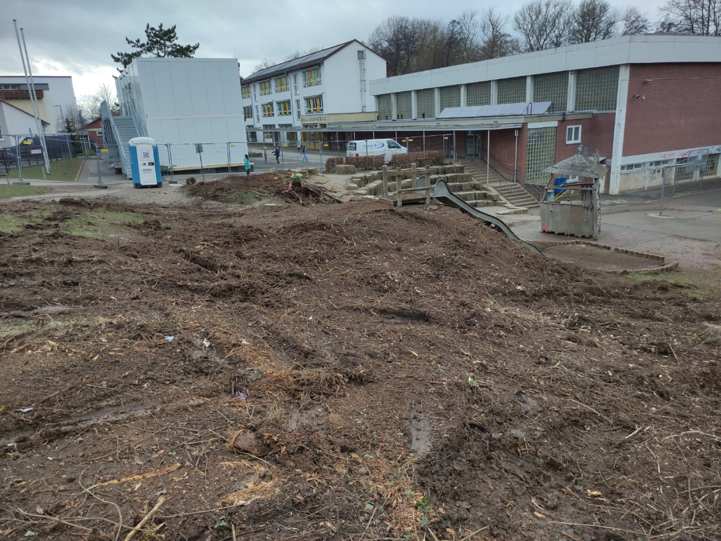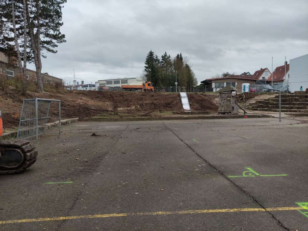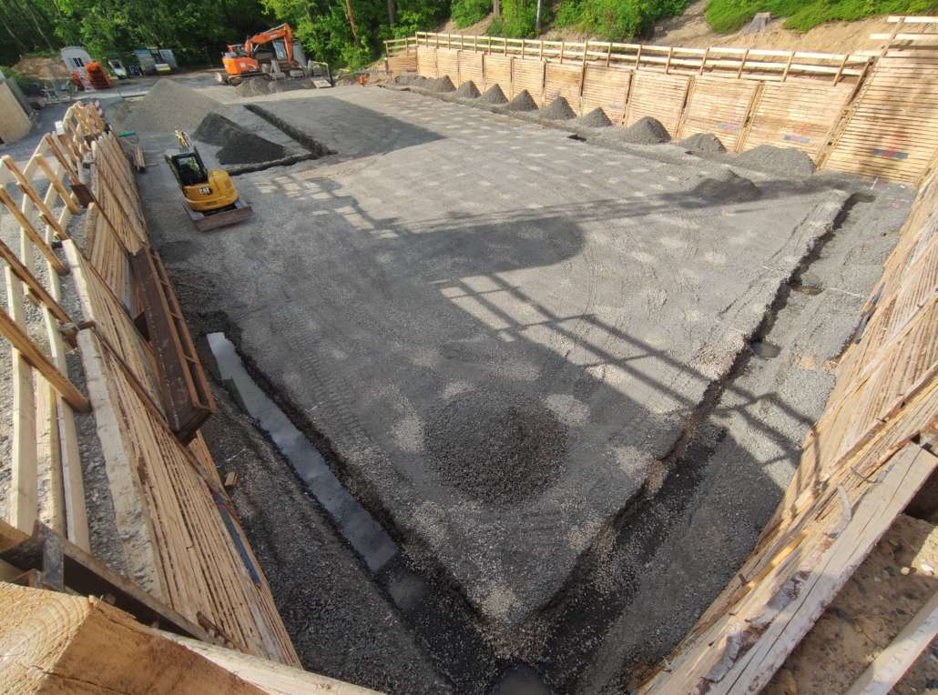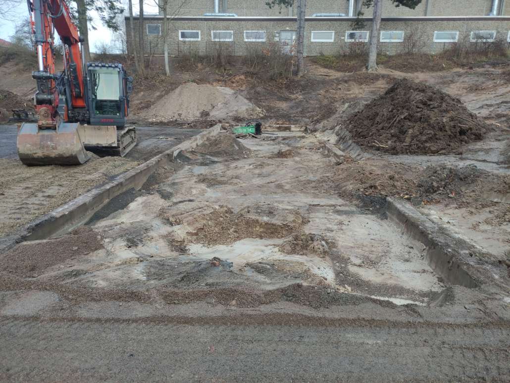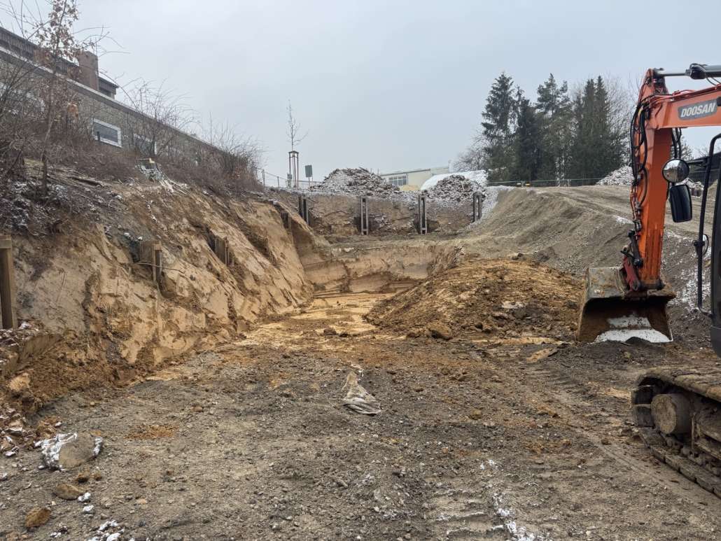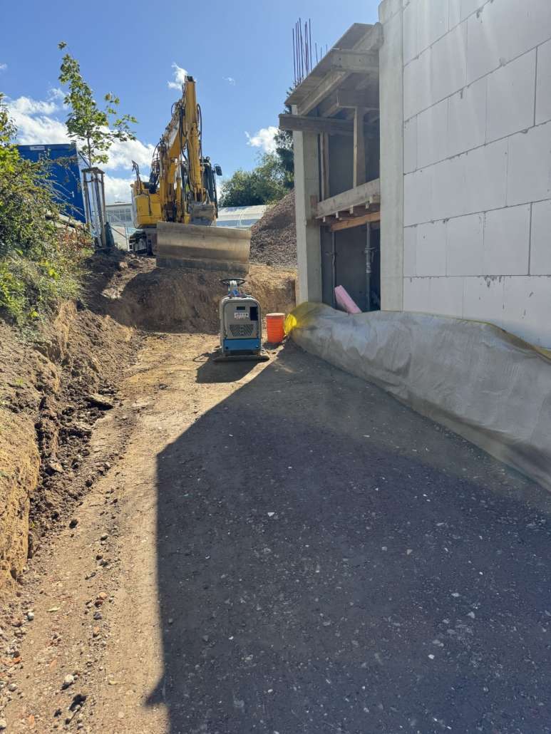 Dann wurde die Grundstücksfläche für den Neubau, als Erweiterung der Schule, vorbereitet. Dabei wurde der Hang zur Straße entfernt und alles planeben hergestellt. Verfüllt wurde die Fläche mit Schotter. Außerdem wurden auf der gesamten Fläche Entwässerungsrohre verlegt, die schließlich mit Kies herum verfüllt wurden.