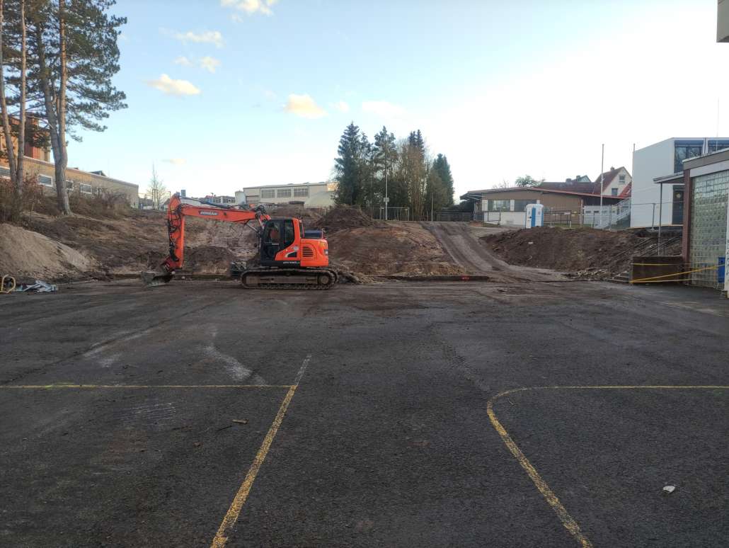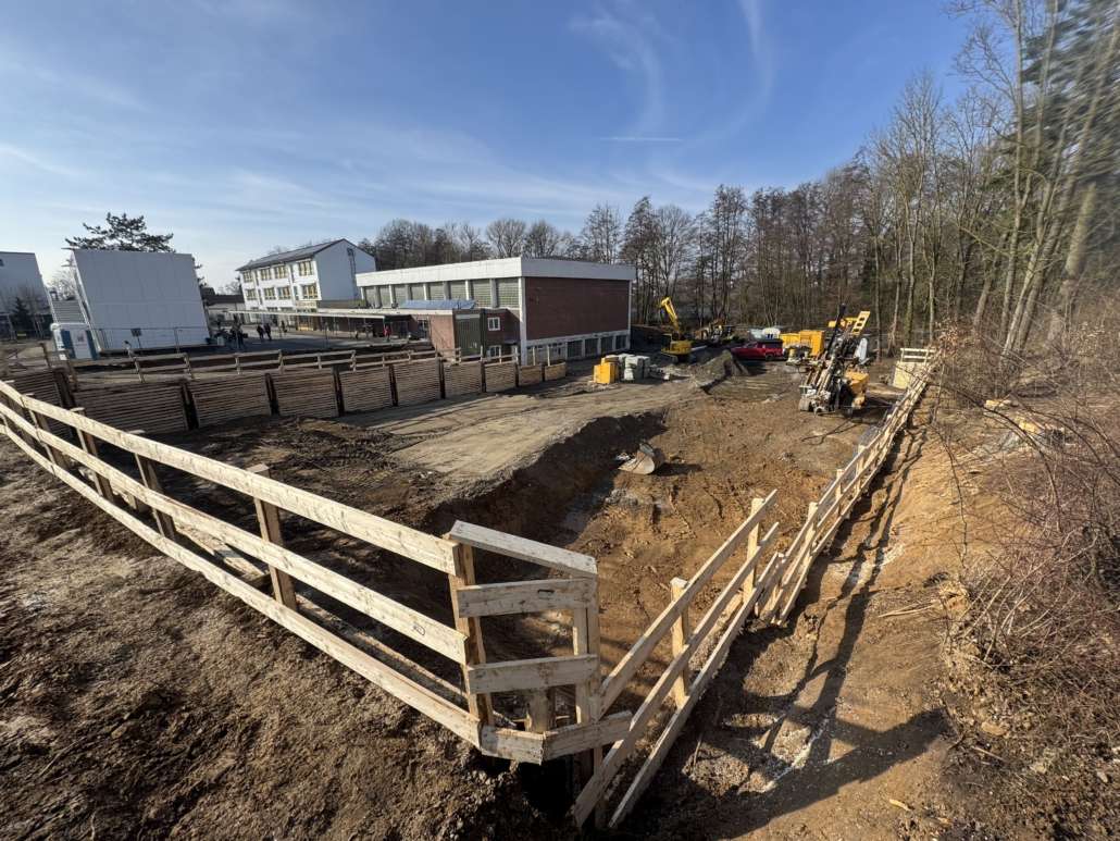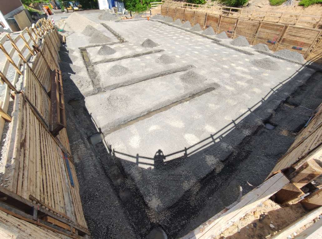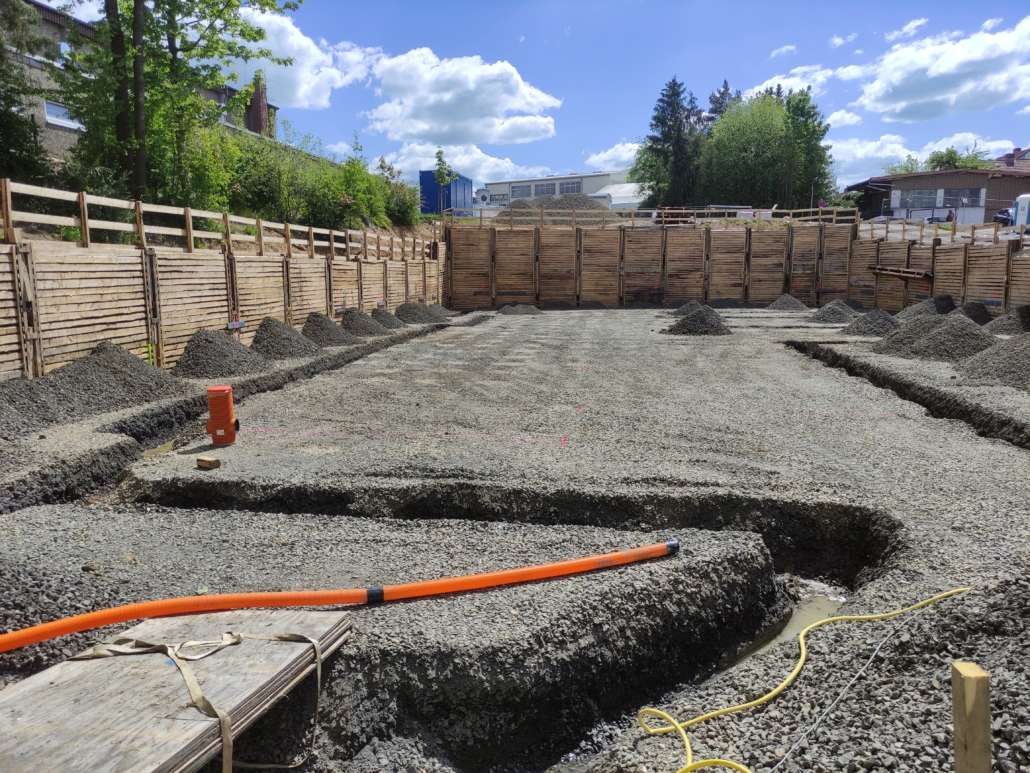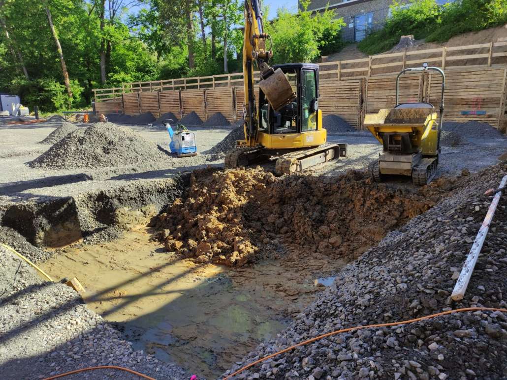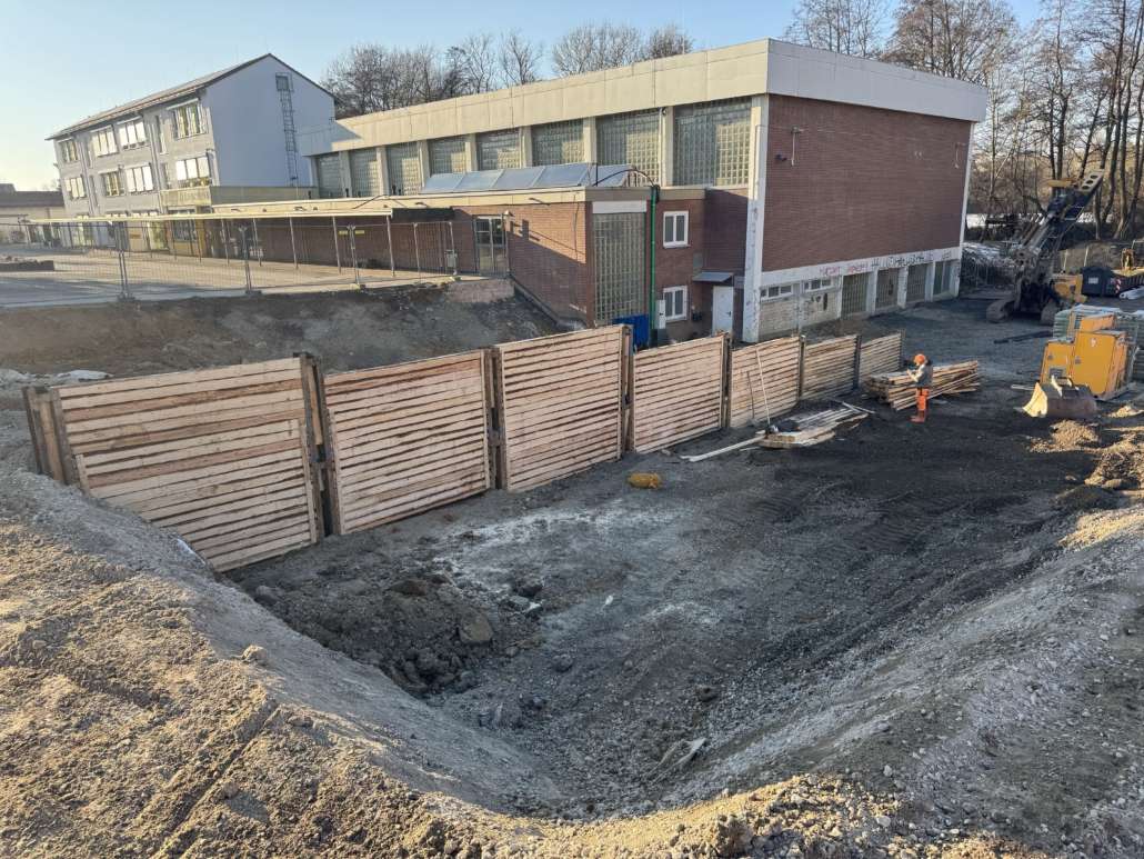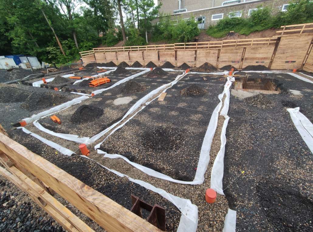 Dann wurde die Grundstücksfläche für den Neubau, als Erweiterung der Schule, vorbereitet. Dabei wurde der Hang zur Straße entfernt und alles planeben hergestellt. Verfüllt wurde die Fläche mit Schotter. Außerdem wurden auf der gesamten Fläche Entwässerungsrohre verlegt, die schließlich mit Kies herum verfüllt wurden.