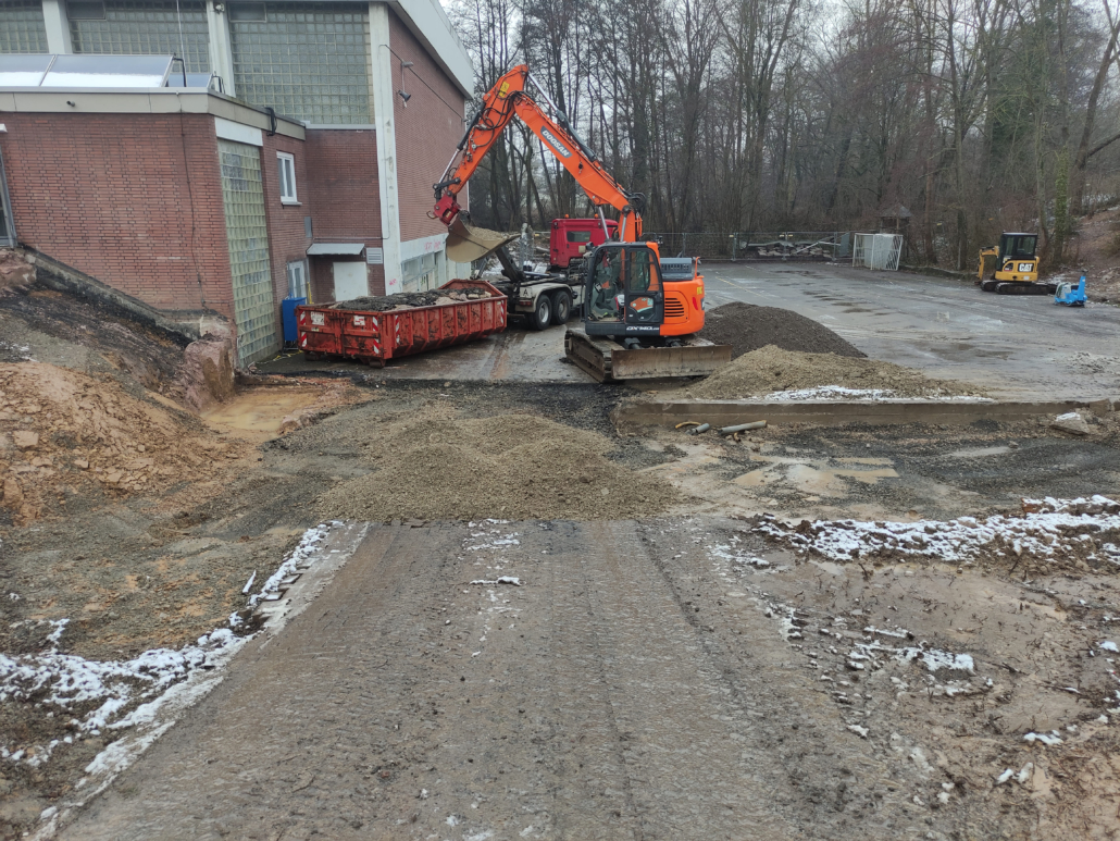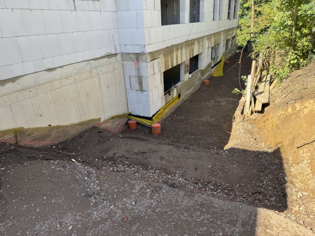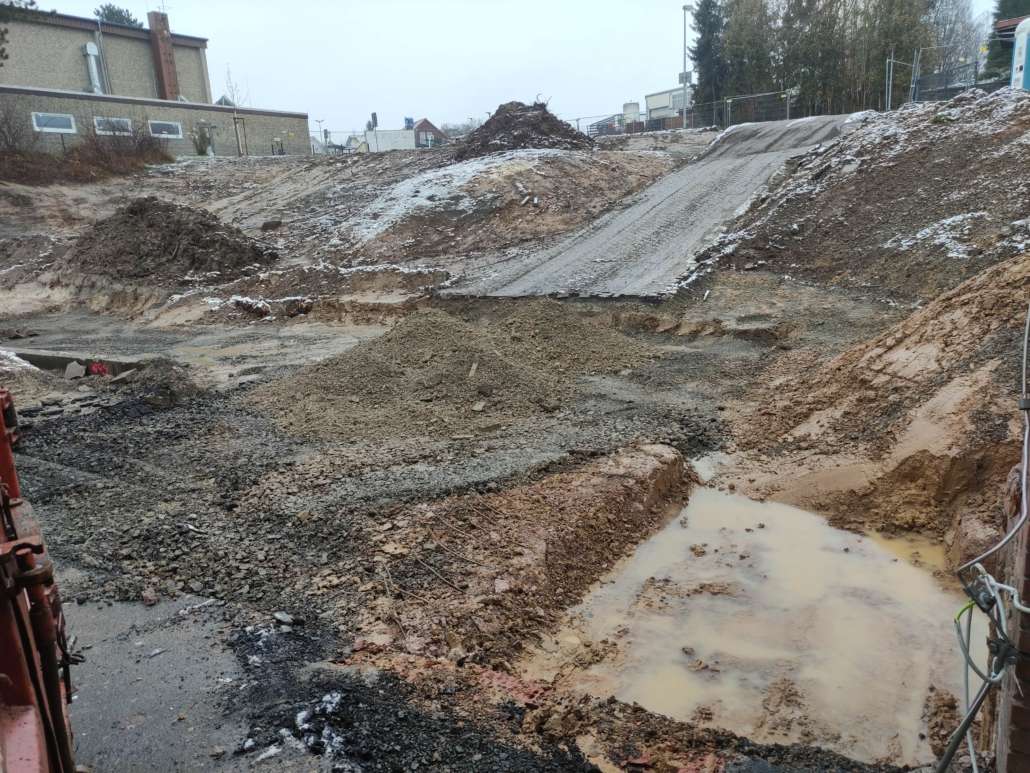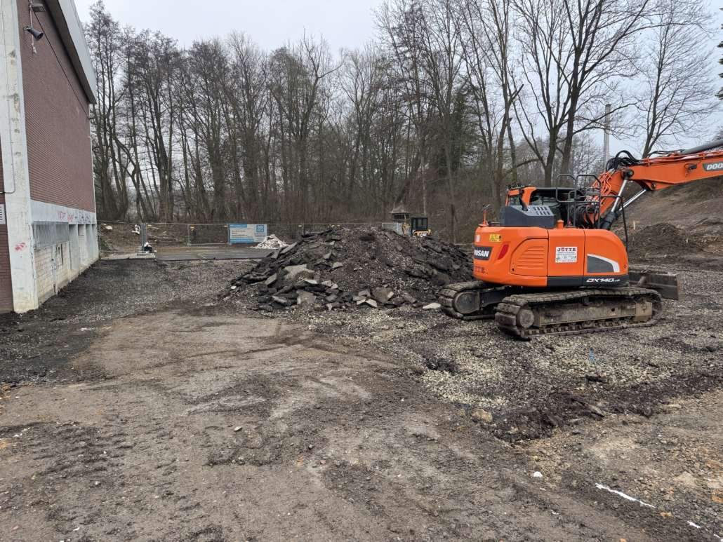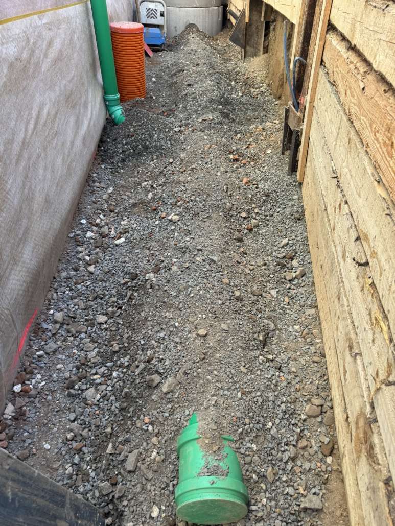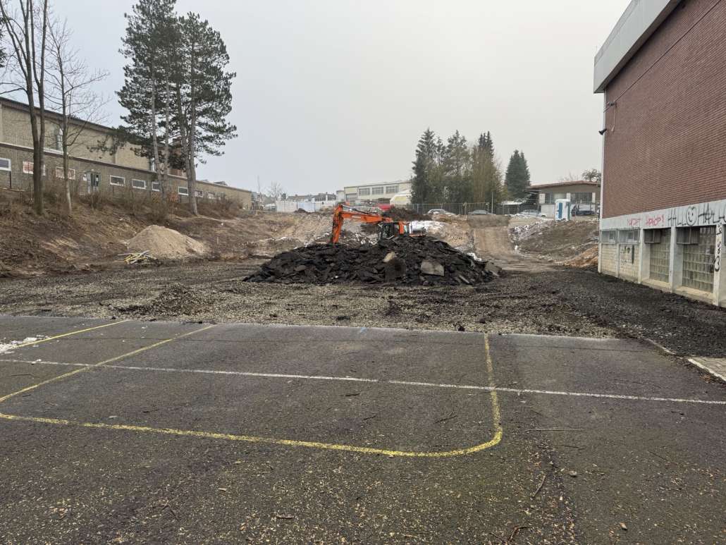 Dann wurde die Grundstücksfläche für den Neubau, als Erweiterung der Schule, vorbereitet. Dabei wurde der Hang zur Straße entfernt und alles planeben hergestellt. Verfüllt wurde die Fläche mit Schotter. Außerdem wurden auf der gesamten Fläche Entwässerungsrohre verlegt, die schließlich mit Kies herum verfüllt wurden.