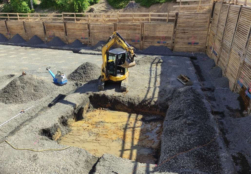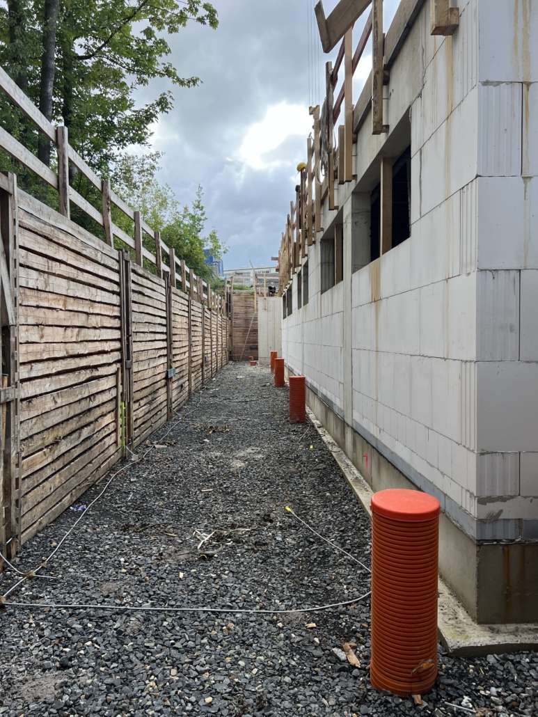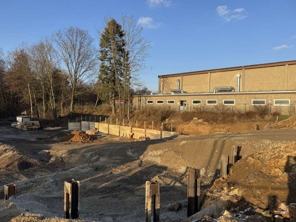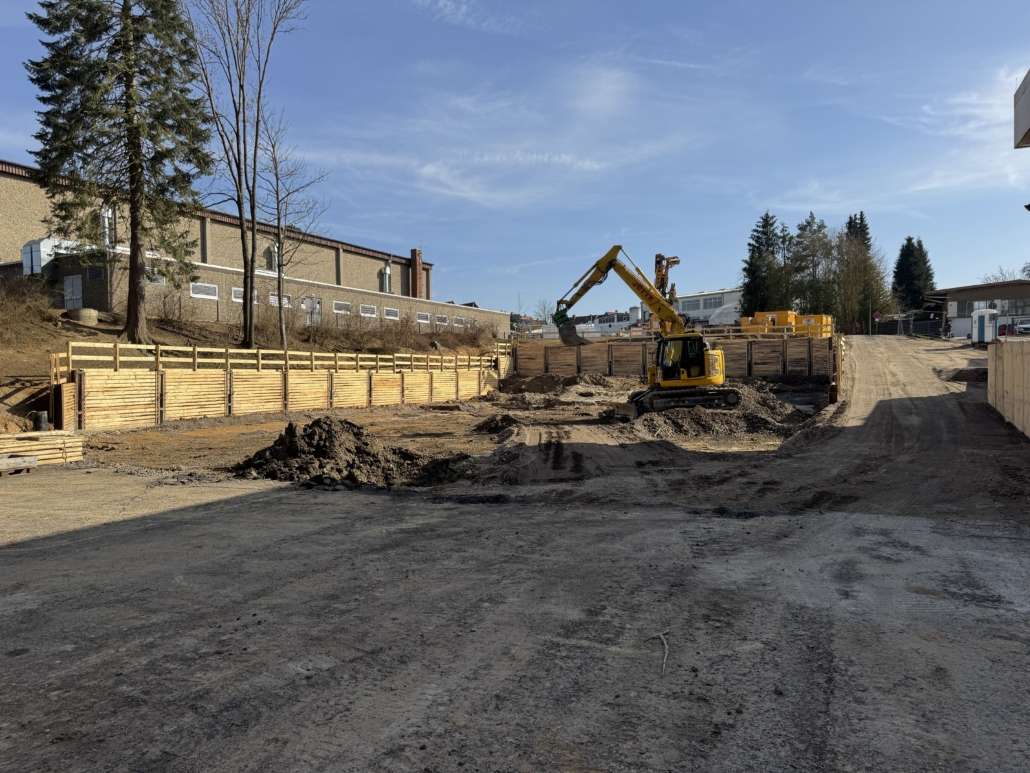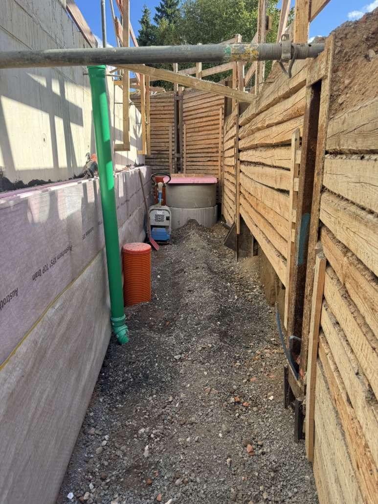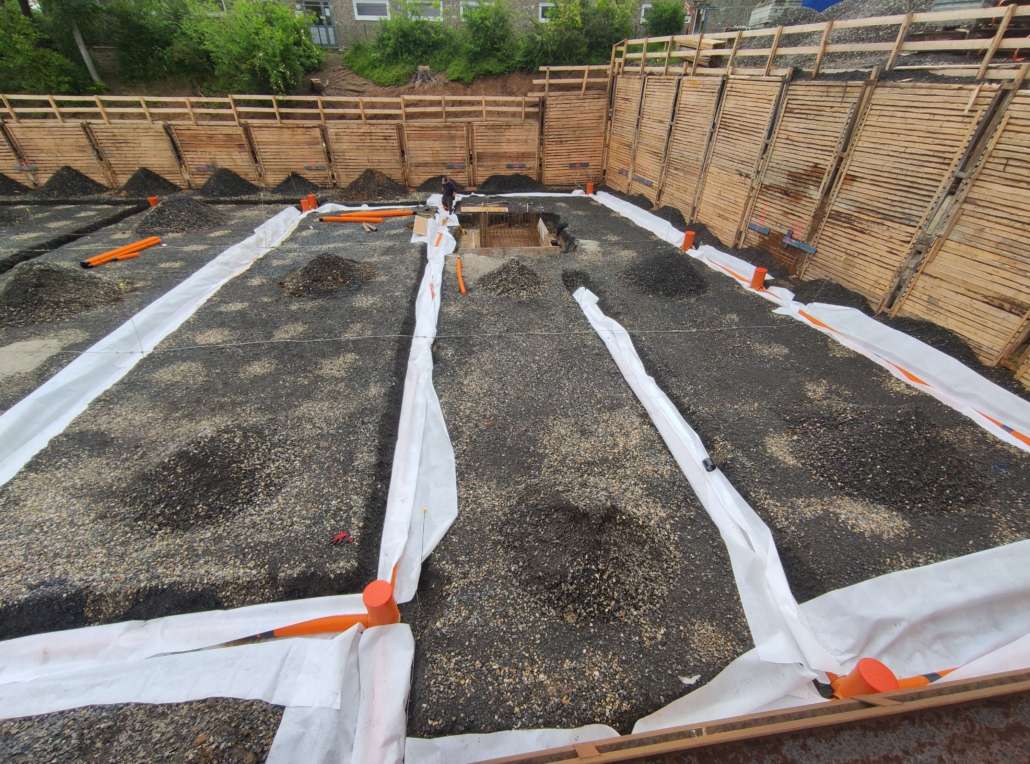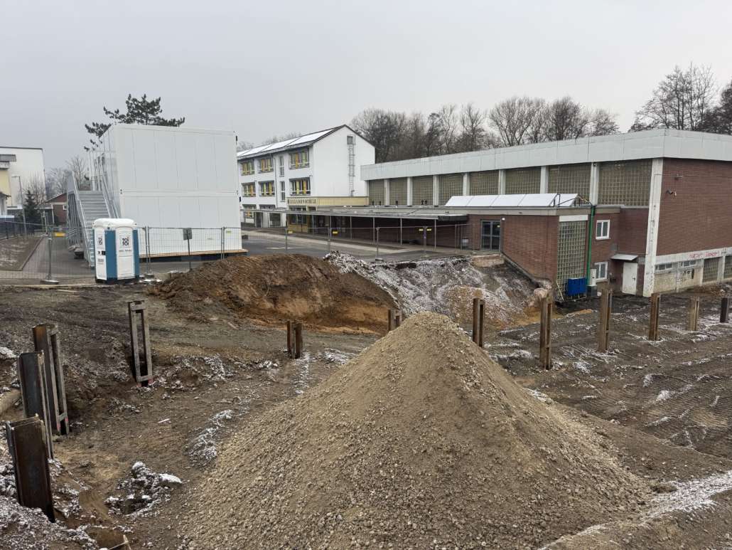 Dann wurde die Grundstücksfläche für den Neubau, als Erweiterung der Schule, vorbereitet. Dabei wurde der Hang zur Straße entfernt und alles planeben hergestellt. Verfüllt wurde die Fläche mit Schotter. Außerdem wurden auf der gesamten Fläche Entwässerungsrohre verlegt, die schließlich mit Kies herum verfüllt wurden.