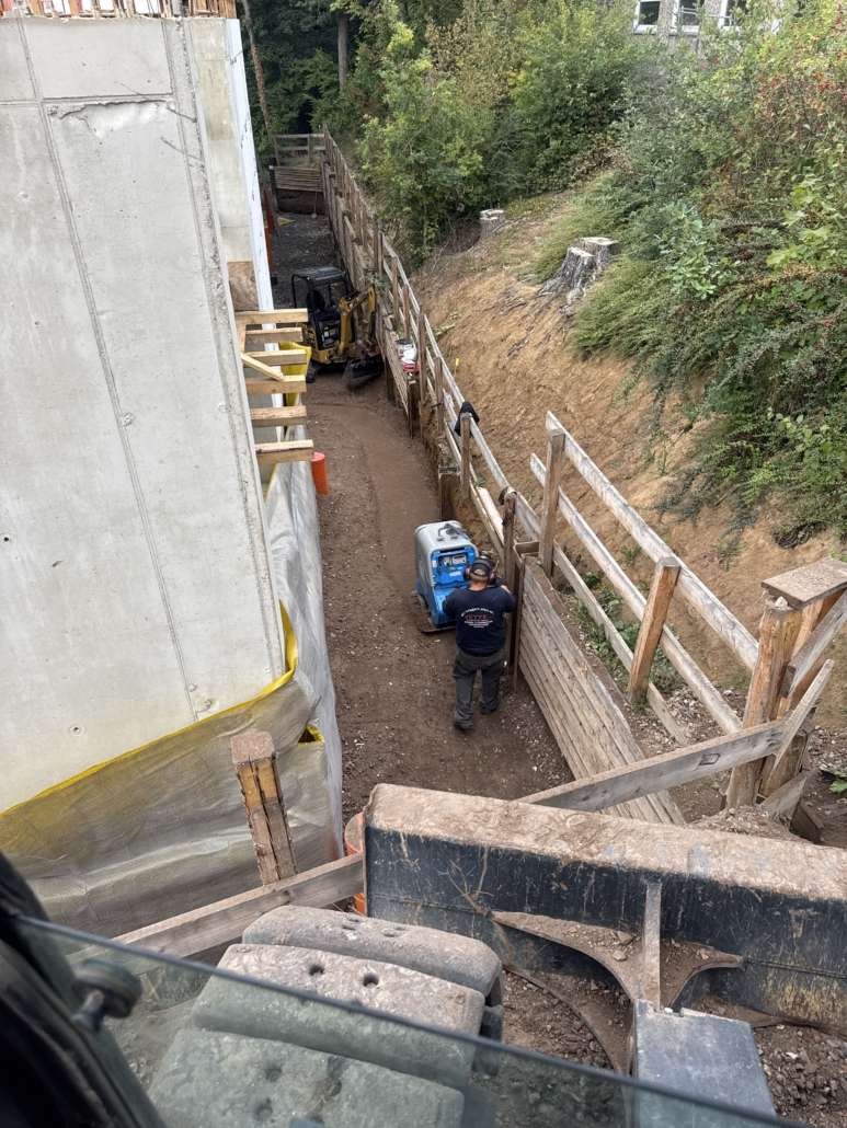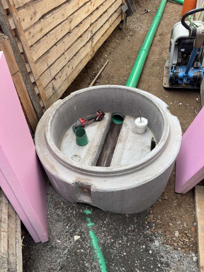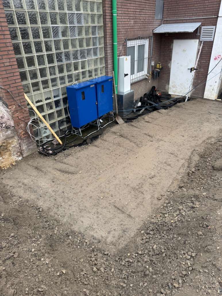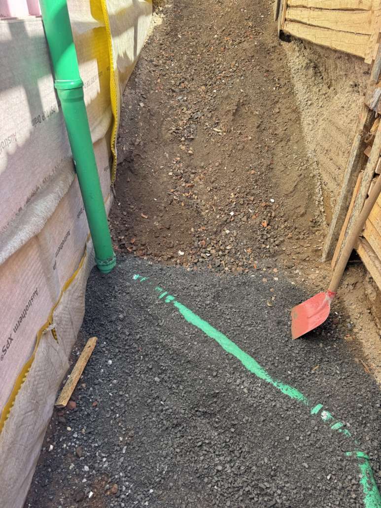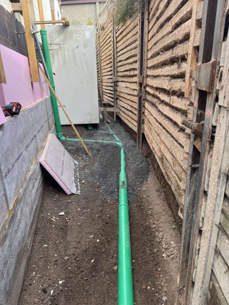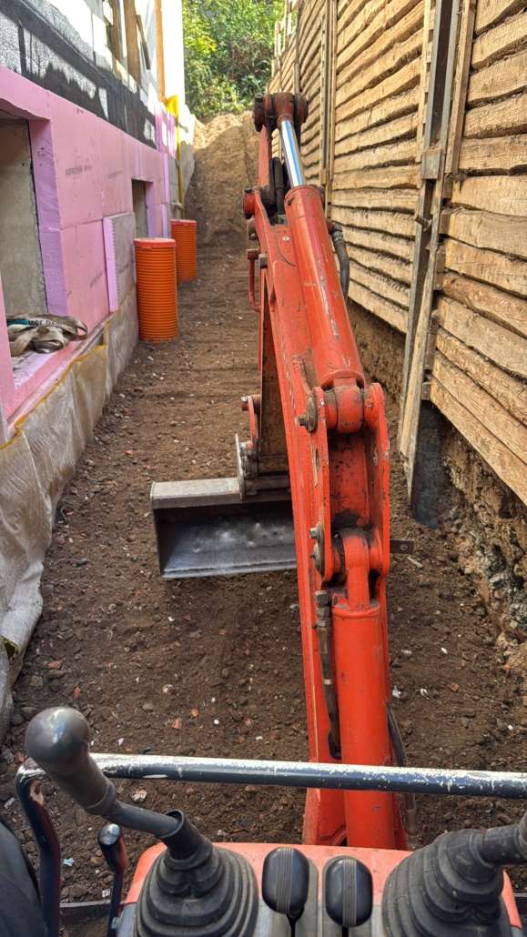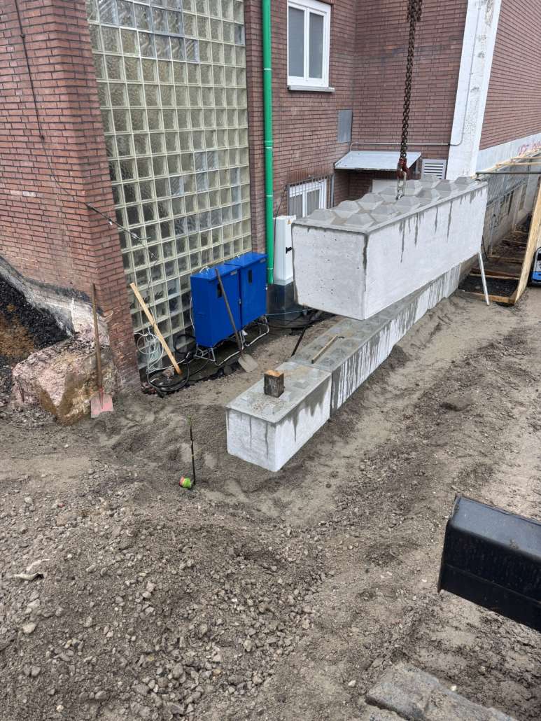 Dann wurde die Grundstücksfläche für den Neubau, als Erweiterung der Schule, vorbereitet. Dabei wurde der Hang zur Straße entfernt und alles planeben hergestellt. Verfüllt wurde die Fläche mit Schotter. Außerdem wurden auf der gesamten Fläche Entwässerungsrohre verlegt, die schließlich mit Kies herum verfüllt wurden.