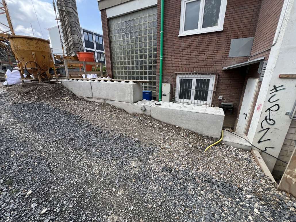 Am alten Schulgebäude wurde eine Betonmauer gesetzt, um einen kleinen Bereich abzugrenzen.
